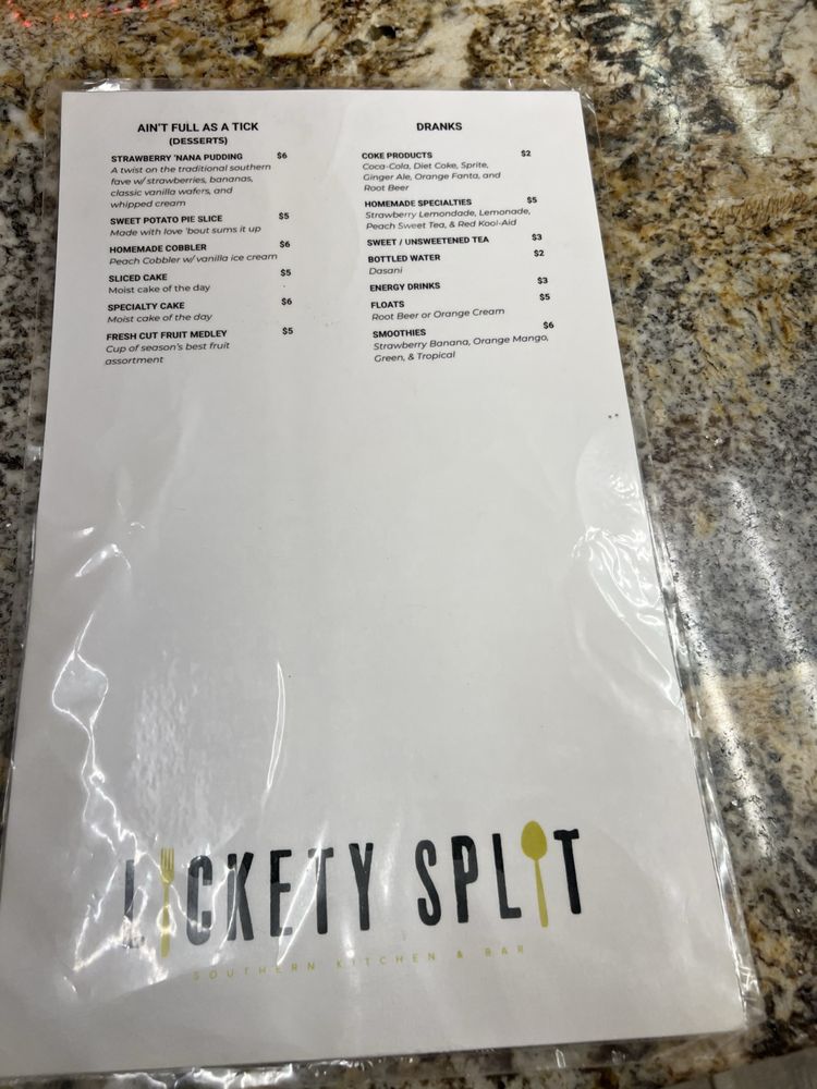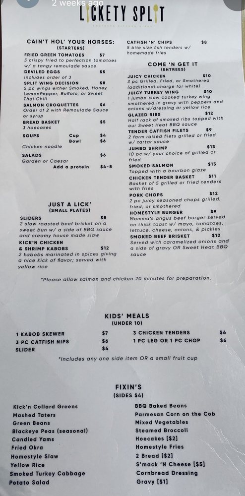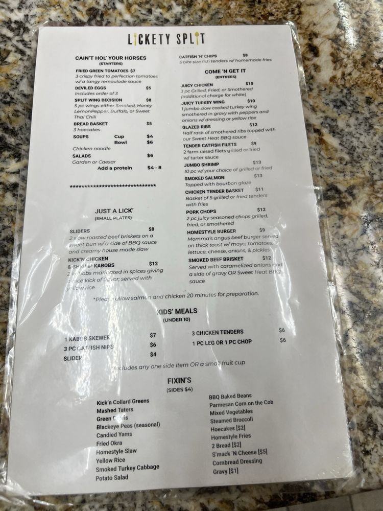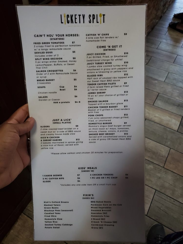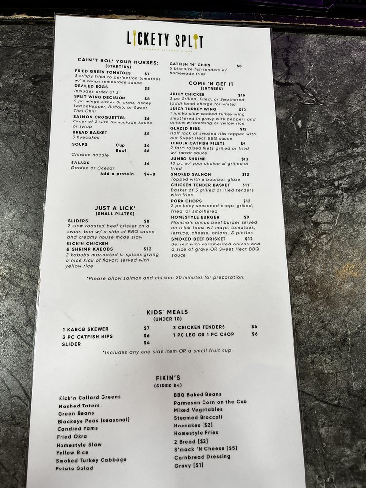 Lickety Split Southern Kitchen & Bar in Hapeville, GA offers a diverse menu with Southern-inspired dishes. From the Hoe Cake Basket to the Split Wing Decision, the flavors are bold and satisfying. Customer reviews rave about the perfectly seasoned fried chicken and attentive service. Additionally, the restaurant is praised for its free parking, outdoor seating, and takeout options. The menu features a variety of options, including soups, salads, and entrees like Turkey wings and mac 'n' cheese. With a cool and trendy vibe, Lickety Split is a great spot for groups and dinner outings. Don't miss out on their Happy Hour specials and outdoor seating. Overall, a must-visit for delicious soul food in Atlanta.